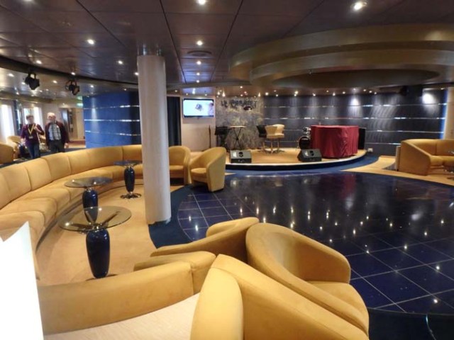The ship’s theater is small, but nice. There is no separate balcony section. All seats are accessible from deck 6. Most of the theater’s seats offer a good view of the show, though there are a few undesireable seats in the back, especially those behind the person manning the lights, who blocks the view. Also the second row has no rise over the first row making the view from those seats easily obscured by anyone sitting in the first row. From the third row up each row is above the one ahead of it except at the very back.