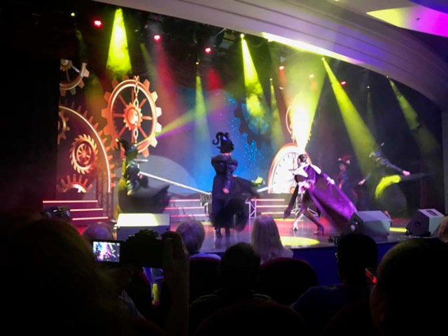 Shows during our cruise were generally of high quality with talented performers. They had a large cast who performed a variety of production shows during our 20-day cruise, with just a few guest performances to give them a night off here and there. The cast included gymnasts, acrobats, an aerialist, and a juggler as well as singers and dancers. There were 2 performances of the same show each night. Besides generally being good shows, they were hugely popular because with no movies or secondary theater on this ship there’s not a lot of other alternatives.