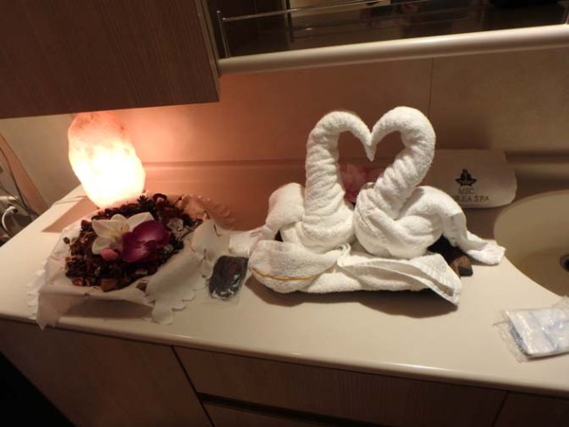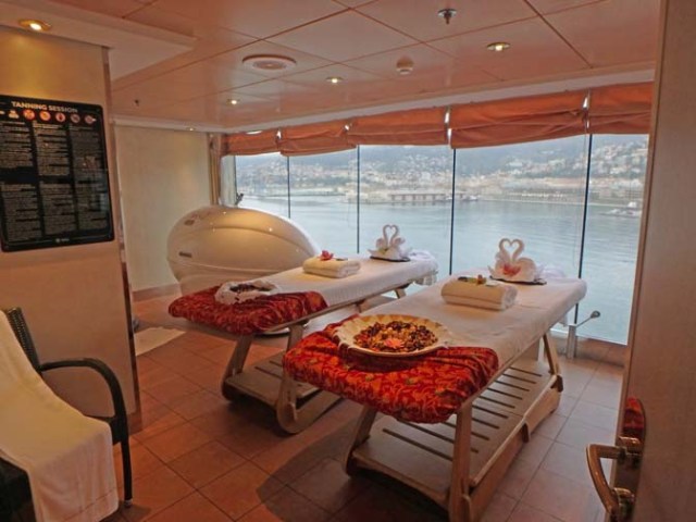 The thermal suite on this ship is cheap compared to thermal packages on other lines, but that’s because there’s not much there. Just a sauna and steam room, seperate ones for men and women because apparently European men like to go in naked, and a few of the women too in spite of the sign at the entrance to the women’s sauna and steam room that says appropriate swimwear must be worn. There’s also 2 relaxation areas with ocean view loungers, a larger forward facing one next to the gym and a smaller one by the men’s area with a view out the side. The smaller one has coffee. There’s no pool or heated ceramic chairs that are the prime places people want to go in most thermal suites.