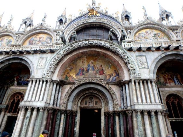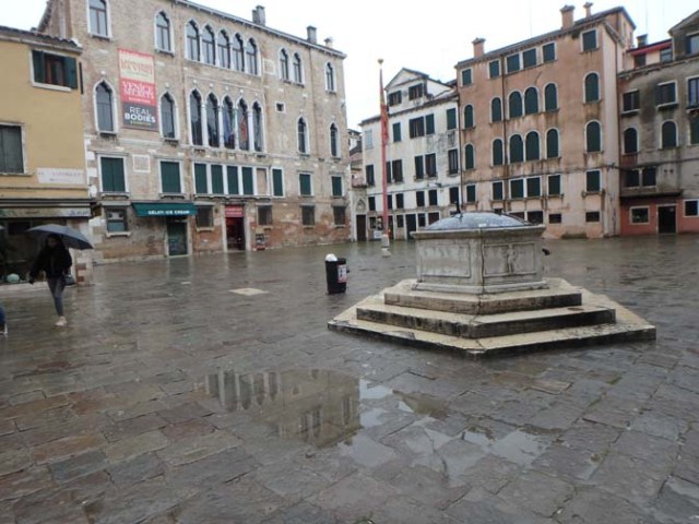 This isolation from the political upheavals of the mainland eventually allowed the Venetians to thrive rather than just survive. Venetians were early explorers, traders, and sailors. San Giocomo, the first church, was built on the islet of Rialto in 421, and is considered as the traditional founding of the city. Architecture of the city is based on pilings driven into the ground supporting the stone slab foundations of the buildings. Between these pilings sinking and water levels rising over the centuries the original ground floors of some buildings are flooded and unusable. High tides and storms flood places like the famous San Marcos square frequently enough that they put portable raised sidewalks out so people have somewhere dry to walk. Raincoat-like boots that pull on over people’s shoes are a popular item sold by vendors around the area.