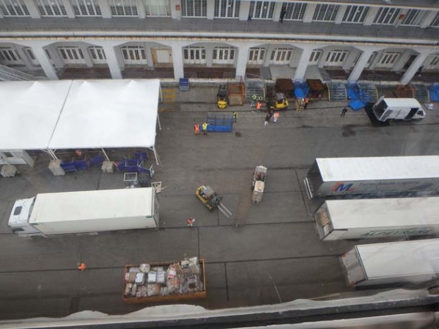At the port we ended up in a long slow moving line because the people from the first 2 busses had been waiting in a room there and were just turned loose to head for the ship when our bus got there. The line at the scanners and passport check would move a little, then stop, move a bit again, and stop some more so it took quite awhile to get through even though we weren’t terribly far back in the line. Finally we got through and had a bit of a walk down the outside of this terminal until reaching the end where we had a short distance to go out from under the sheltered side of the building before reaching the stairway up to the ship. Luckily it had stopped raining by then because for awhile on the bus ride over it was such a downpour we’d have been soaked in just that short distance and our luggage didn’t get to our room for hours so we would have had nothing dry to change into. It did finally arrive long after all the rooms around ours got theirs, so at least it made it on the ship. First loaded in the truck, last off. It was probably well buried under the luggage of everyone who got to the port after us. If you have things you think you might need before your luggage gets delivered it’s a good idea to keep them in your carry-on, but it hadn’t started raining yet when we checked our bags.