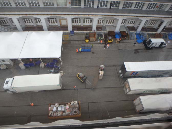 looking down from the ship to stuff getting loaded onboard in the port