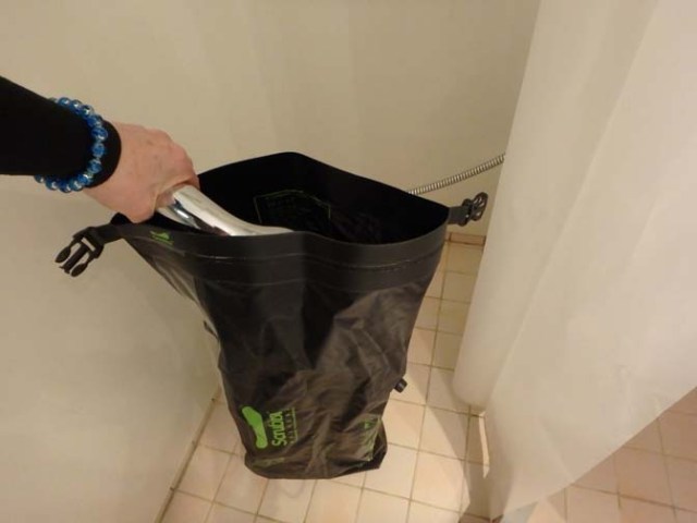 It’s hard to fill the bag in the cruise ship bathroom sink, but easy to fill it from the shower since the showerhead is always on a movable hose and you can just stick the showerhead into the bag and fill. It’s a good idea to do the washing part on the shower floor so any leakage just goes down the drain.