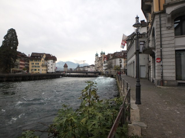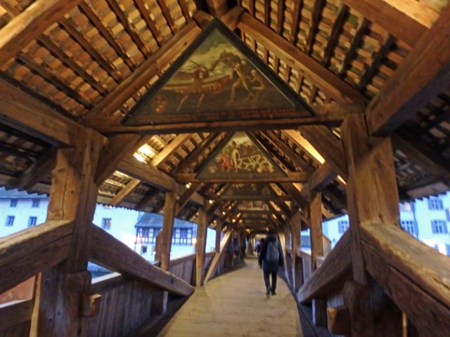 The town’s most famous bridge, the covered Kapellbrücke (Chapel Bridge) was originally built in 1333. Parts of it had to be rebuilt in 1993 after a fire suspected to be caused by a carelessly discarded cigarette. The Chapel bridge links the Aldstat to the Reuss River’s right bank. Another famous bridge is the Mill Bridge built in 1408 and painted with a macabre series of plague paintings known as the Dance of Death. A small chapel was added to the middle of the bridge in 1568. You could walk across this bridge and never even notice the paintings as they are up in the rafters. You have to look up to see them. The chapel bridge has paintings in the rafters too, just not plague paintings.