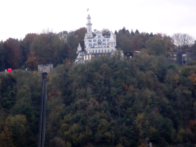 From there we could see what looked like a funicular going up a steep hill to a castle. The internet says the Gütsch Bahn was a funicular railway running directly from Baselstrasse in Lucerne up to the Hotel Château Gütsch, (which looks like a castle). The funicular was built in 1881 to provide access to the hotel and opened in 1884 as a water ballast railway. In 1990 the Gütschbahn was converted to automatic operation and in 2015 the old funicular railway was replaced by two modern inclined lifts. The journey to Gütsch today takes just one and a half minutes. So apparently it was the inclined lifts we could see in the distance. Going up to the hotel is free for booked guests, and other people can buy a ticket.