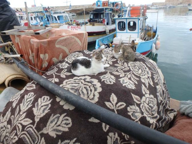 Besides boats the marina also had cats. We saw a mother and some half grown kittens sleeping near some fishing boats. There were other cats around the marina as well as in town. Greece has lots of stray animals. Some places have dogs as well as cats.