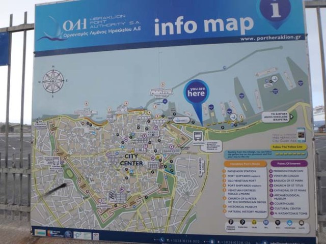 Ships dock in the port of Heraklion (Iraklion) in a container port so passengers are not allowed to walk through the port after disembarking the ship. Those with cruise ship tours board their tour bus by the ship. The rest take a 5-minute free shuttle to the cruise terminal. People have to pass through the terminal before going anywhere else. Free city maps are available at the tourist office there. It has a duty free shop on the port side where people can purchase things after the security screening on their way back. There’s also a small shop on the other side of security near the exit door. Inside the building there are places to sit and use the free wifi provided there. The terminal building has restrooms and storage lockers. It’s about a 15 minute walk from the cruise terminal to old town. There are tourist attractions within a 20 minute walk from the port. Street signs are in Greek.