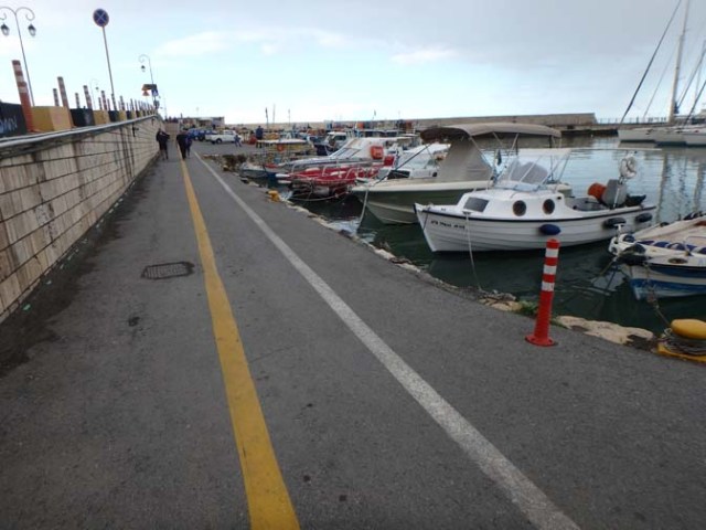 The footpath follows along the waterfront past a marina. It ends at a city map with a you are here dot. From there you can tour the Koules Fortress – originally a Venetian sea fort -just a short distance away for a minimal entry fee, or walk into the city or on the seawall.
