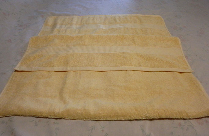 fold bath towel in half across the short side, then fold back the top end about halfway