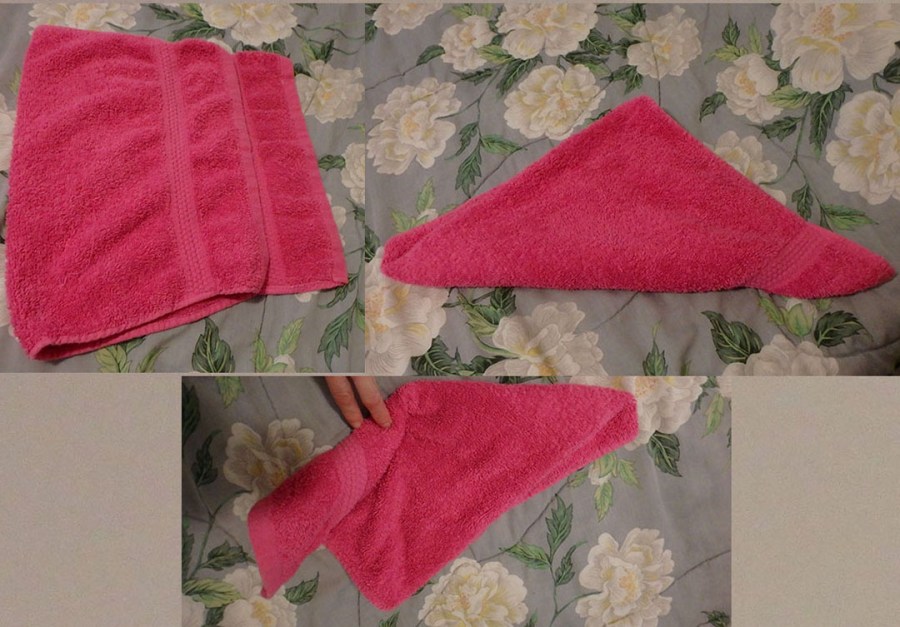 fold the hand towel over across the short side so that it becomes a square. Fold the square in half diagonally turning it into a triangle. With a finger holding down the center of the long side of the triangl, roll each end nearly to the middle.