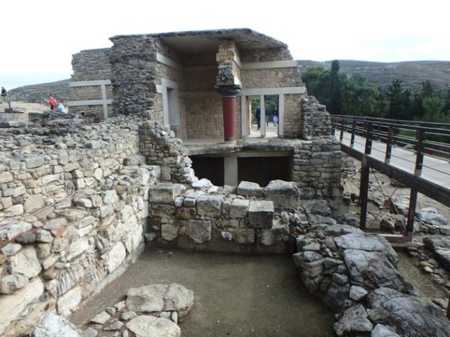 The bus actually pulled into a parking lot and stopped at Knossos, the major archeological attraction of that area. The ruins there have several layers built atop one another with the oldest layer being an ancient city. Newer ruins were built atop the original city in an older and then newer Minoan palace, rumored to be the location of the labyrinth of the minotaur. All of it is ruins now, with some restorations done in the late 1800’s in the fashion of what people of that era thought things would have looked like before they were ruins. Some preservation has been done since to other areas as well, though more in the form of adding protective roofing, not rebuilding. You do have to buy an entrance ticket to see Knossos. There are lots of little gift shops across the street.