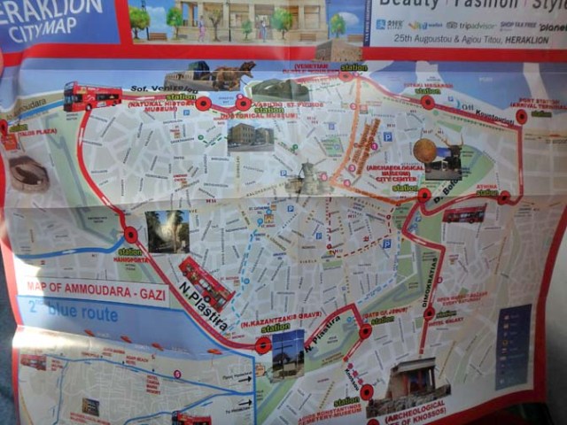 The next place of interest after Knosses is the city center, also a popular stop for people wanting to get off the bus. The bus route map shows a walking route through the city that goes by a fountain, but we just wandered aimlessly through the streets between shops.