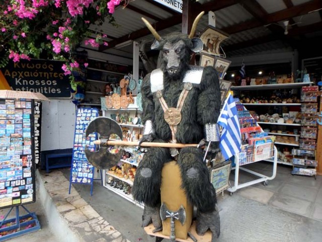 Across the street from the ruins a row of souvenir shops lines the roadway. Minotaurs are a popular theme in the shops, but there were also quite a few items with owls and other creatures as well as things like pornographic coasters or playing cards depicting ancient Greeks in compromising positions. Besides a lot of knick knacks and other souvenir type items, some shops had clothing or jewelry and there was a bar/cafe at the end of the row.