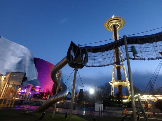 Meanwhile some of the glass sculptures in the Chihuly Garden & Glass exhibit look amazing in photos so that probably would have been the better choice, although no matter how interesting objects are the kids would still rather do things than look at things. Which is why they had so much fun at the Science Center. They also had a lot more fun at the playground just outside of the MoPOP than they had in the museum – and the playground is free whether you have the Seattle CityPass or not.