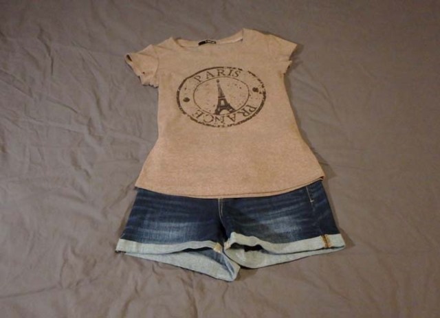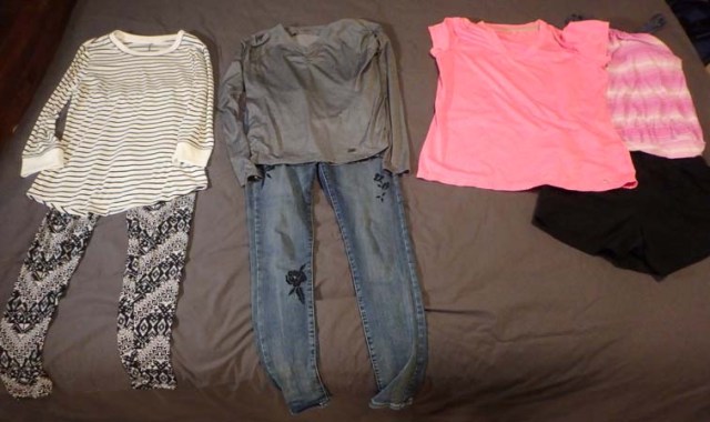 a t-shirt turns into a long-sleeved shirt with long johns, and the formal night shirt turns casual paired with jeans while the dress yoga pants go casual paired with the t-shirt