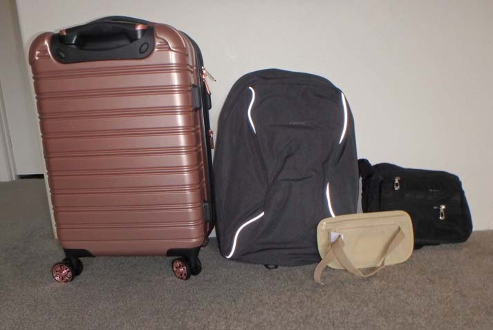packing for a month-long journey on land and sea in a carry-on size bag, backpack, and travel purse (plus waist wallet)