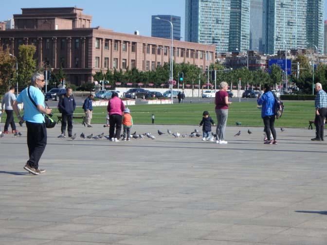 people feeding the pigeons at People’s Square in Dalian, China