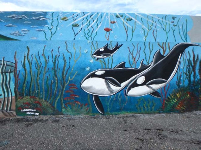 About halfway to the end there’s a row of artwork, some painted murals and some metal art sculptures. Most of the metal art is along the wall, but there’s a rusty mermaid out on a rounded-edged wide spot across from where our ship, the MSC Lirica docked. There’s a bench there where people can sit to rest or enjoy the view.