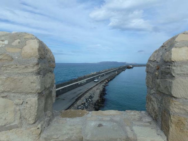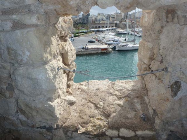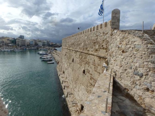 It cost 2 euros to go inside this Venetion castle near the cruise port in Heraklion, usually called by its Turkish name of Koules Fortress, though during the Venetian period it was known as Castello a Mare or Rocca a Mare. For anyone without walking difficulties, it is within walking distance of the port. Just follow the well-marked yellow line along the pathway to the city center and you’ll be there. The distance from the cruise terminal to the fort is about a kilometer and a half.