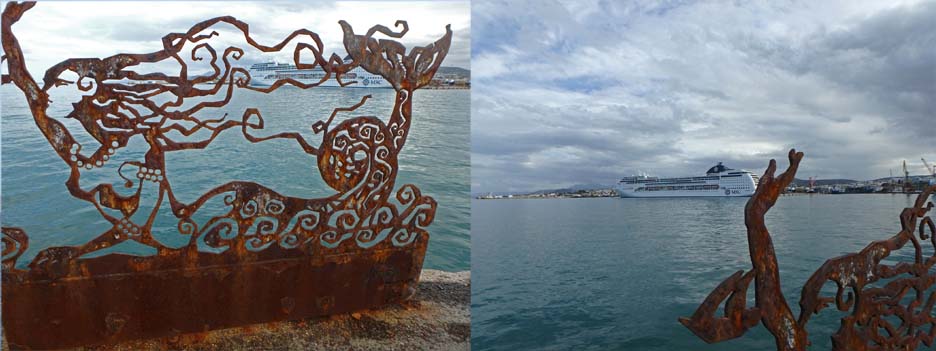 two views of the MSC Lirica from a seawall in Crete, Greece
