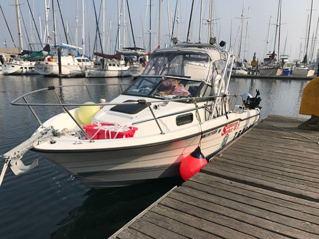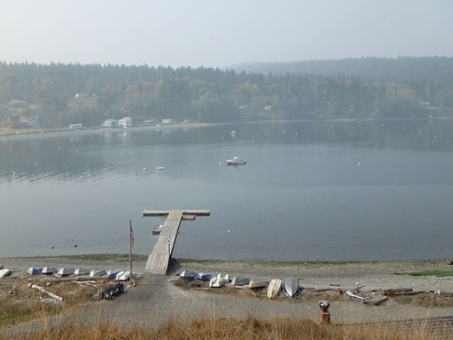 our boat on a mooring buoy by the Decatur Head dock when visibility was good through the smoke – sometimes you couldn’t even see the water from the shore and this photo was taken from up a hill