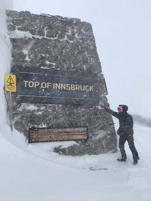We stepped outside into a howling wind blowing icy bits of frozen snow so hard you couldn’t face into it with open eyes as the wind would drive those little bits of ice right into them. It was maybe a 20-foot or so walk to the sign that said Top of Innsbruck so we made it that far for a couple quick photos and went back inside. It was a long 20 feet in that weather and there was no chance of hiking any farther that day. It was snowing so hard we probably couldn’t have even found the trails if we’d tried.