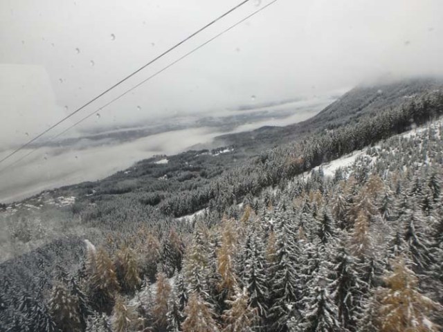 If we’d had more time in Innsbruck we would have chosen a nicer day to go up the mountain, but when your time is limited and you want to do something you do it anyway and just dress for the weather the best you can. We didn’t have snowsuits, but we wore good raingear so we did stay fairly dry.