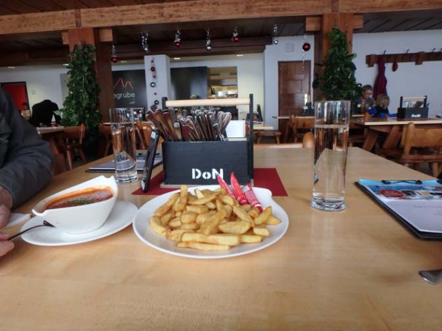 We had lunch at a table by a window. We had their homemade tomato soup and French fries. We had to ask for more ketchup. At least we were able to get it there. In Lucerne when we tried to get more than the skimpy amount of ketchup provided we ended up with unwanted extra orders of fries to go with it. The whole wall next to the windows had a radiator running the length of it. There weren’t a lot of people in the restaurant at that time so they all had tables by the window. Everyone spread their coats, hats, scarves, gloves, and whatever else they had that was wet out over the radiator by their table to dry while they ate. Everything we had worn out on the mountain that was not covered by our raingear was soaking wet so we had our gloves and things on the radiator too, and hung the raincoats over the back of a chair near the heat so the outsides of them could dry as well.