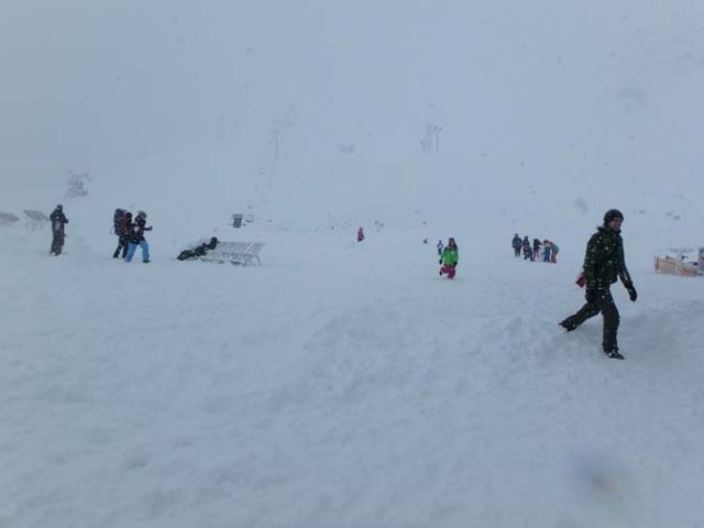 It stopped snowing for awhile while we were there so after lunch we went out to explore for a bit before going the rest of the way down the mountain. We didn’t bring proper snow clothes or boots that would keep snow out doing anything other than walking over the top of it with us on this trip, but we had good enough clothing to walk around the area a bit and watch other people having fun on the little bike sleds and playing in the snow.