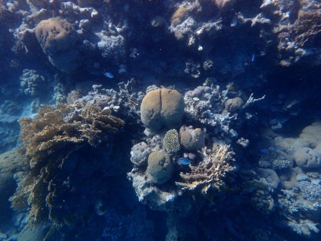 On most of it the main reef is beside rather than under you, with just small corals below, though there are spots where the reef juts out into the snorkel area, or there is a larger bit below. All sorts of fish swim about, mostly medium to large ones for reef fish. The reef is not a large one and the corals were fairly small, but some of the fish were very bright and colorful. The prettiest ones were also the speediest so the swarms of sergeant majors were about all that came out clearly in my photos.