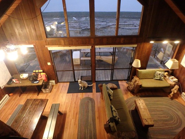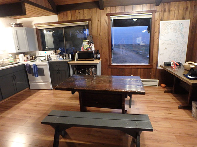 The living room has 2 couches and lamps mounted on rustic wooden tables. The full kitchen has a picnic table for eating space, and another one without the benches for putting things on. Dishes and pans and other kitchen essentials are provided, but people have to bring all their own linens and paper products as well as food and bedding. Access to the island is by private boat or island charter service. There is no garbage service so all garbage leaves with the guests.