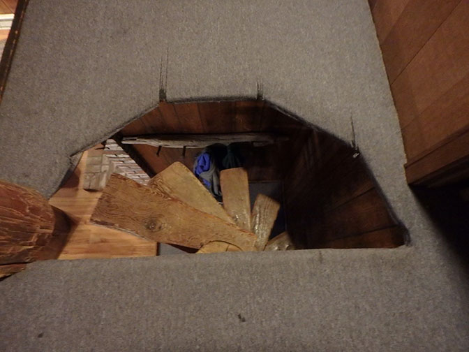The stairway winds up through a hole in an open sided ledge with a doorway into the bunkroom. The one bathroom in the cabin sits on the lower level between the two bedrooms.