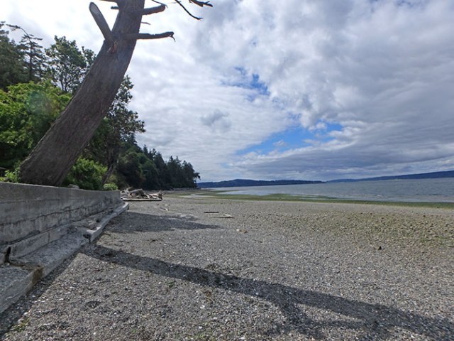 The lot we found to park in was one level up from a café, but that was closed too. We had a picnic lunch in a backpack so we didn’t need it anyway. A trail from the parking lot led to one that went either up to the woods or down to the beach. We went to the beach first. Our timing was better on this one as the tide was way out, though even at high tide there would probably be a bit of beach with the possible exception of an extremely high tide. We went as far as the park boundary in one direction, then the other. Near the cabins a large building was marked as a center for wooden boats. Back in the lodge days it would have been a boathouse for the fishing boats. Remnants of a section of barnacle encrusted track from a former launch sat deteriorating on the beach, no longer connected to the boathouse or even to itself the entire way down. A container ship sat anchored near the shore of Whidbey Island across the channel, perhaps waiting for its turn to unload, most likely in Everett since that’s the nearest port.