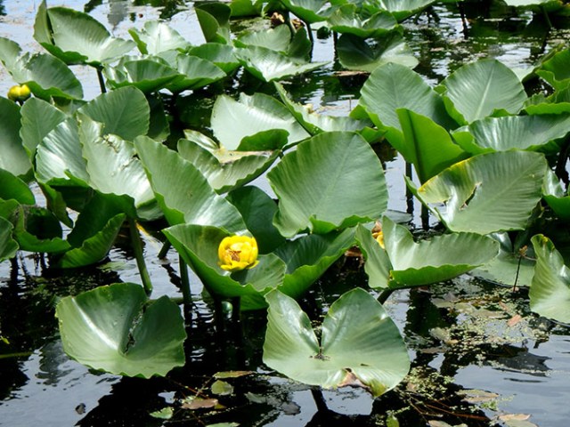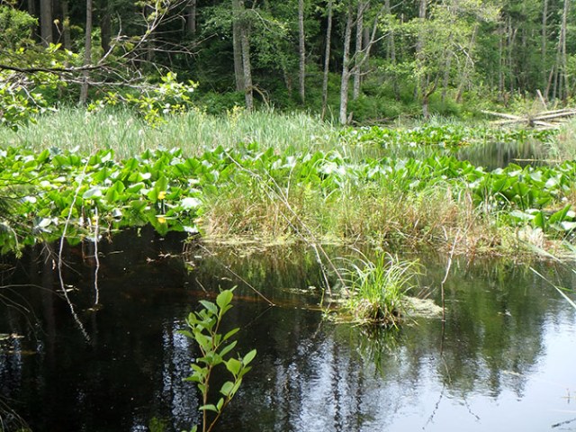 We went back up the trail toward the woods. A trail leading off of it was marked as going to the other state park, but we decided to take the one marked Cranberry Lake instead. Along the way we passed a number of what you would expect to be educational signs next to the trail. Most places with that sort of signs give out information regarding the plants or animals of the area. These signs tended to say things like imagine what the trail would look like if you were a bird flying above it. We only found a few that had any useful information. One had a photo of one of the broad-leafed yellow flowering plants that Cranberry Lake was full of and identified it as a pond lily. Which was fitting I guess since the lake looked more like a giant pond than what people usually think of as a lake. Another said the narrow path at the end of the trail that went a ways out into the lake was the top of a former beaver dam. The third had a picture of a rabbit and said they were a non-native species that had been introduced to the area in the 1930’s as game animals. The rest just had blurbs as useless as the one about imagining you’re a bird.