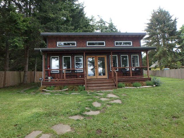 For the most part this cabin is very easy to find. You just take the Stanwood/Camano Island exit off I-5 and head west. The street changes names a few times along the way, but we never had to turn off it. My GPS was unaware of when we had arrived though so it never alerted us that we had reached our destination. The cabin is set back a ways from the road and you don’t see it as you come around a corner. I’d have missed it if it weren’t for the arrow-shaped sign with the address on it pointing down a gravel driveway people otherwise may not notice. When we got back into the car the next morning the GPS wanted to know if we wanted to continue our route as it still hadn’t realized we were already there. Once you turn at that arrow and head down the gravel driveway you can see the cabin.