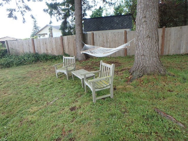 The living room area held a sofa and two chairs, one with an ottoman. It had windows pretty much all the way across the side facing Puget Sound, with a view of Saratoga Passage, Whidbey Island, and the Olympic Mountains. The view also included the backyard which had a fire pit and chairs to sit around the fire and a hammock. A porch extended across that side of the cabin, and had a couple seating areas for anyone wanting to sit on the porch to enjoy the view. There’s no TV or internet, but nature provided entertainment. Besides the view there were often birds in the yard and sometimes a squirrel.