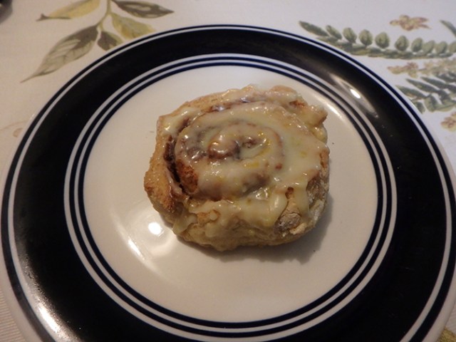 Mix melted butter for filling with orange juice and zest. Spread evenly over dough. Mix sugar and cinnamon together and sprinkle over the butter. Roll into cinnamon roll shape by rolling dough up across the long side, using the parchment paper to carefully roll it up a bit, then peel the paper back before rolling then next bit.