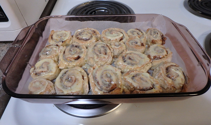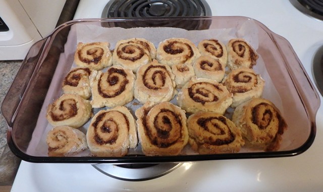 Grease the bottom of a 13 x 9 inch baking dish or line with parchment paper. Use a piece of thread to cut the dough into 1-inch pieces by placing middle of a length of thread under the dough and then crossing the two ends over the top and pulling them away from each other until the thread passes completely through the dough. That is how to neatly and evenly cut bread dough without squishing or smashing it. Shake or brush any excess flour off each roll before placing it in the pan. Cover it with a dish towel and let it rise in a warm place for about an hour.