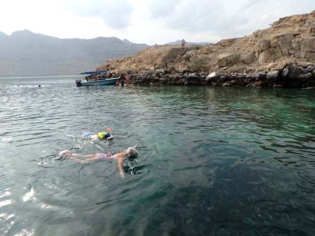 We had just 11 passengers on our boat, though it could have held more. Which meant everyone had lots of space. Most spoke English, but there were a few Italians. There was also a girl from the ship’s shore excursions department. She said she was from Iran, but she also spoke both English and Italian. She wore shorts and no headscarf, and a regular western style 1-piece bathing suit with a skirt. Most of the women from the ship had long pants or skirts rather than shorts as we had been told to dress conservatively, though at the snorkel stop not everyone with 2-piece bathing suits put t-shirts over them as was recommended since Oman is an Islamic country.