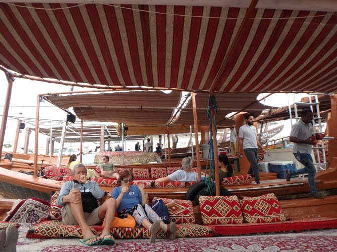 at the start of the tour some people walk through the line of boats to their assigned dhow while others settle in