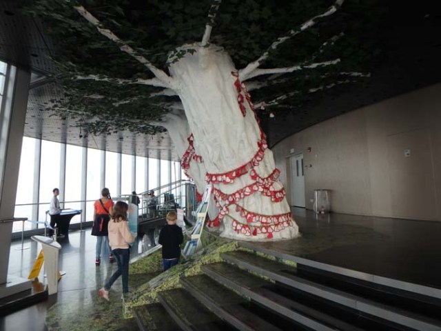 the viewing area has full length windows circling the outside in a donut-like hallway, and other things like this artificial tree at the inside