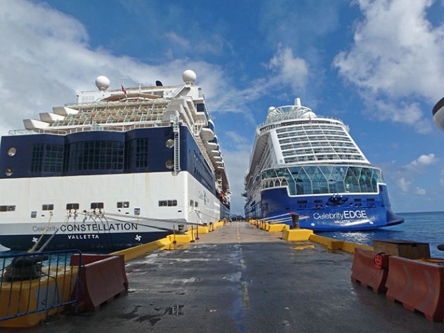 Ours was the only ship there when we left for our excursion, but when we got back besides Carnival Dream there was also Celebrity Edge and Caribbean Princess. The Princess ship looked pretty small compared to the rest, but for some reason from the dock Constellation looked bigger than Edge. An optical illusion due to the positioning of the two on the dock I suppose because Edge is actually quite a bit bigger, as was obvious once we were onboard. On the other hand, Caribbean Princess actually was considerably smaller than the other three ships docked there.