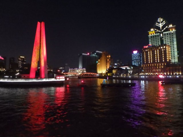 Our cruise went along the river with great views of both the Bund and Pudong sides. It went a bit farther up the river where there were some other lighted buildings we didn’t really see from the main Bund area before it turned around near a bridge and headed back toward the dock. People could sit inside the boat and look out the windows or go up on deck outside. It was a warm enough evening that most people went outside on the deck where views and photos are better than through windows in the boat, though sometimes it did get a bit crowded where finding clear unblocked space to take a photo could be a challenge.