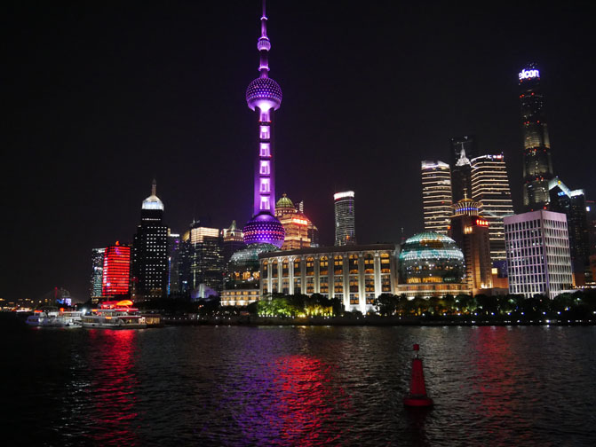 the Pudong area comes to life in the evening with buildings turning into lightshows