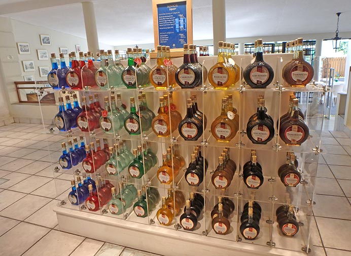 display of different flavors and colors of Curacao liqueur in a gift shop at the Cholobolo factory
