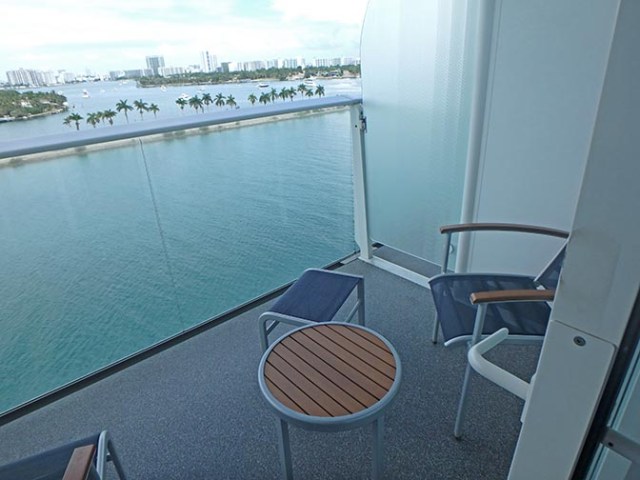 All that aside, it’s nice to have the balcony regardless. It gives you a bit of private outdoor space if you want to sit outside in peace, or if you just want to know what the temperature is like before getting dressed to go ashore. And the view is great too. Since there’s not a clothesline in the shower on Symphony of the Seas, it also made a bit of space to hang wet swimsuits over the chairs at least until they stopped dripping when returning from snorkeling while the ship was still in port. This was the first ship we’ve ever been on that did not have a clothesline in the shower, which even if you never do any laundry is always useful for the swimsuits. The shower did not have good places to tie a line across it either so the sort of clothesline with suction cups would have been the best for that ship.