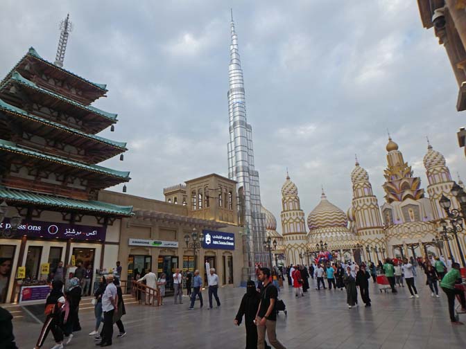 replicas of Burj Khalifa and a pagoda just inside of Global Village