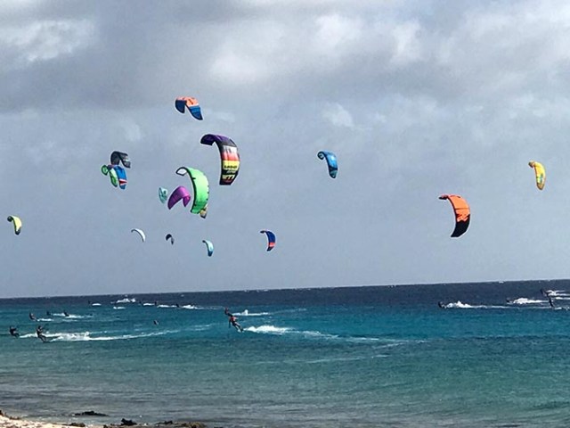 Besides snorkeling and diving, other popular sports on Bonaire include kiteboarding and windsurfing. Along one stretch of the beach the sky was sprinkled with brightly colored kites. So many it looked like it must be hard to keep them from tangling up in one another, but the people out there know what they are doing. Martha said they were really farther apart than they appeared. Sometimes one would come in close to shore. Some of them jumped up out of the water quite high, which was fun to watch.