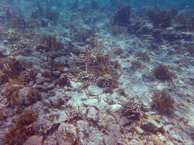 Finally everyone but Linda was in the water. They led us closer to shore where there was rocky structure for fish to hide in and some coral. I tried to stay with Barbara, which isn’t always easy when snorkeling, but we managed to stay near enough to find each other whenever we got separated. Most of the coral was fairly small, but there were some pretty good sized patches of staghorn coral. Unfortunately a lot of it was broken. I don’t know if that was from a hurricane or human caused damage. There were quite a few small brain corals and I saw one fan coral and a bunch of tubelike structures I didn’t recognize. They had warned of fire coral, though when I saw that before in Belize it was much larger than those tube things so they may have been either young, a different kind, or some entirely different sort of creature. Fire coral looks like coral, but is actually not coral at all, but rather something related to jellyfish – and it stings. Like actual coral there are different types of fire coral so some of what looked like unfamiliar coral species could have been the fire coral. Everything that looked like coral was small and near the bottom so not where anybody would accidently touch it.