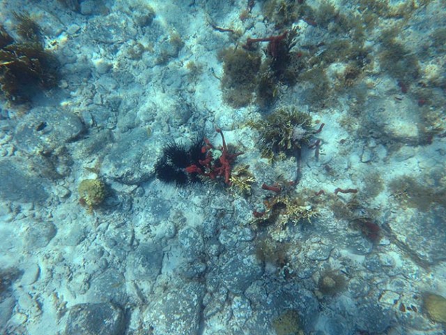 There were lots of black spiny sea urchins, some of them quite large. The bigger fish tended to mostly hide under the rock ledge, but would come out sometimes. Smaller fish stayed in sight more. I did not see the abundance of striped sergeant majors that are usually present in large schools when snorkeling in tropical places.